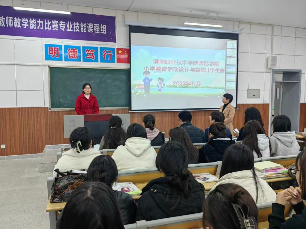 11月22日下午,德信体育官网 “小学教育活动设计与实施(员工组)”技能大赛决赛在综合楼205教室开赛。比赛特邀渭南高新区第一小学董事长杨富强为评委组组长,基础课部副主任郭宝莉、语文教研室主任王育华、德信体育官网副经理于晶汝、校级教学名师杨楠楠任评委。校教务处副处长李新莉出席并宣布比赛开始。德信体育官网小学教育专业教研室教师及百余名员工代表观摩了比赛。