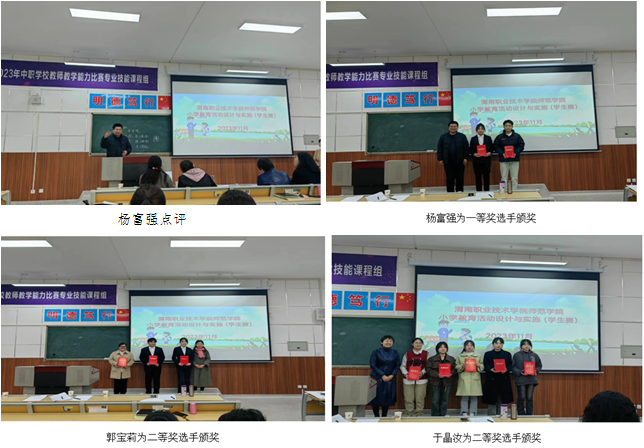 课堂展示后,杨富强作了精彩点评。他表示,参赛选手在比赛过程中紧扣小学课程标准对应课程理念,已经有了职业教师的风采,但在教与学的关系处理、课堂引导等方面存在些许不足。他希望参赛选手在后续的学习中要继续提升自己的教学能力,为将来工作做好充足的准备。