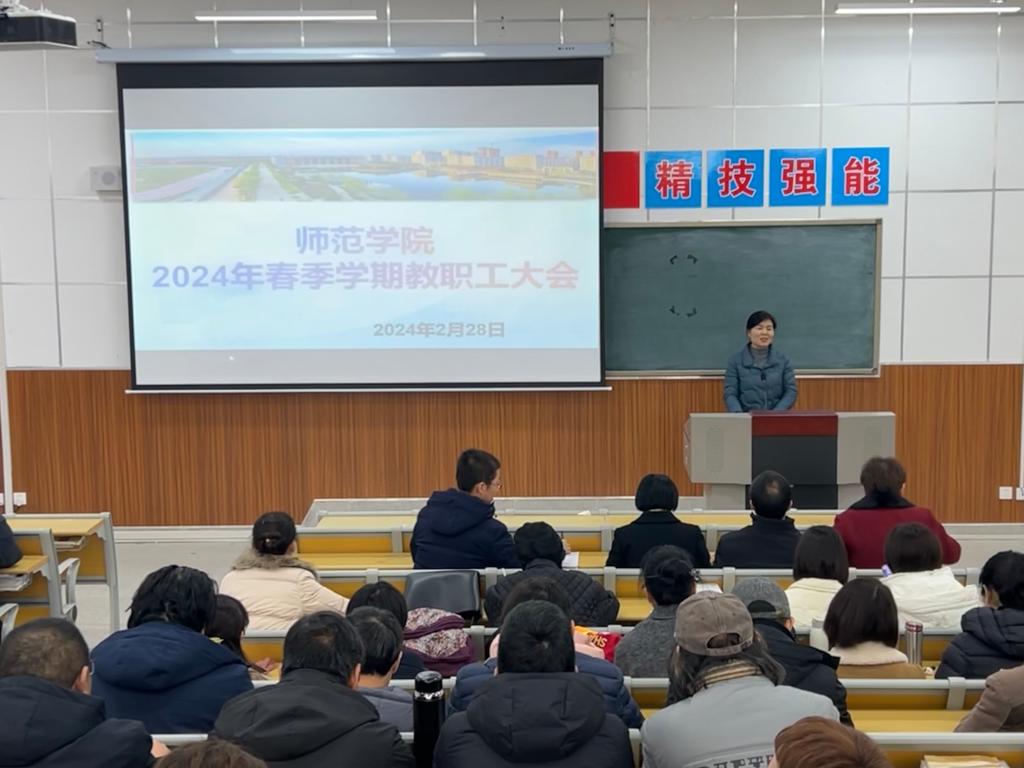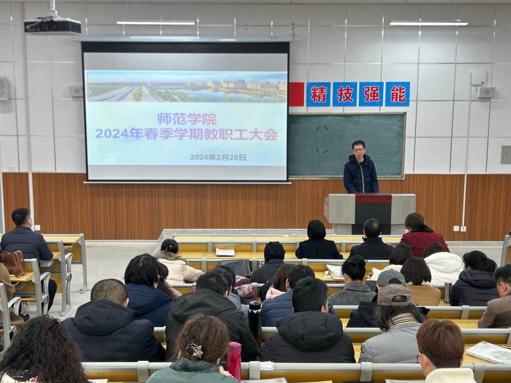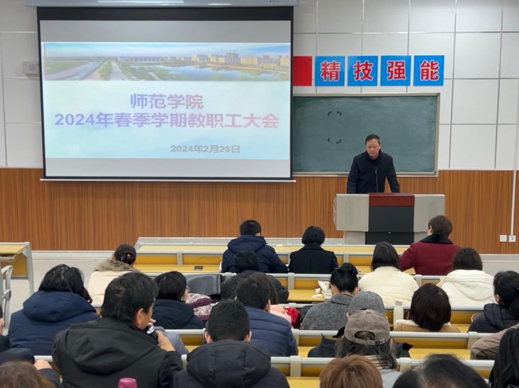 为科学谋划新学期发展方向,确保各项工作有序开展,2月28日下午,德信体育官网在综合楼203教室召开2024年春季学期教职工大会。公司党总支书记杨瑞侠,经理郭楚伟,副经理于晶汝、李永明等领导班子成员出席,全体教职工参加。会议由杨瑞侠主持。