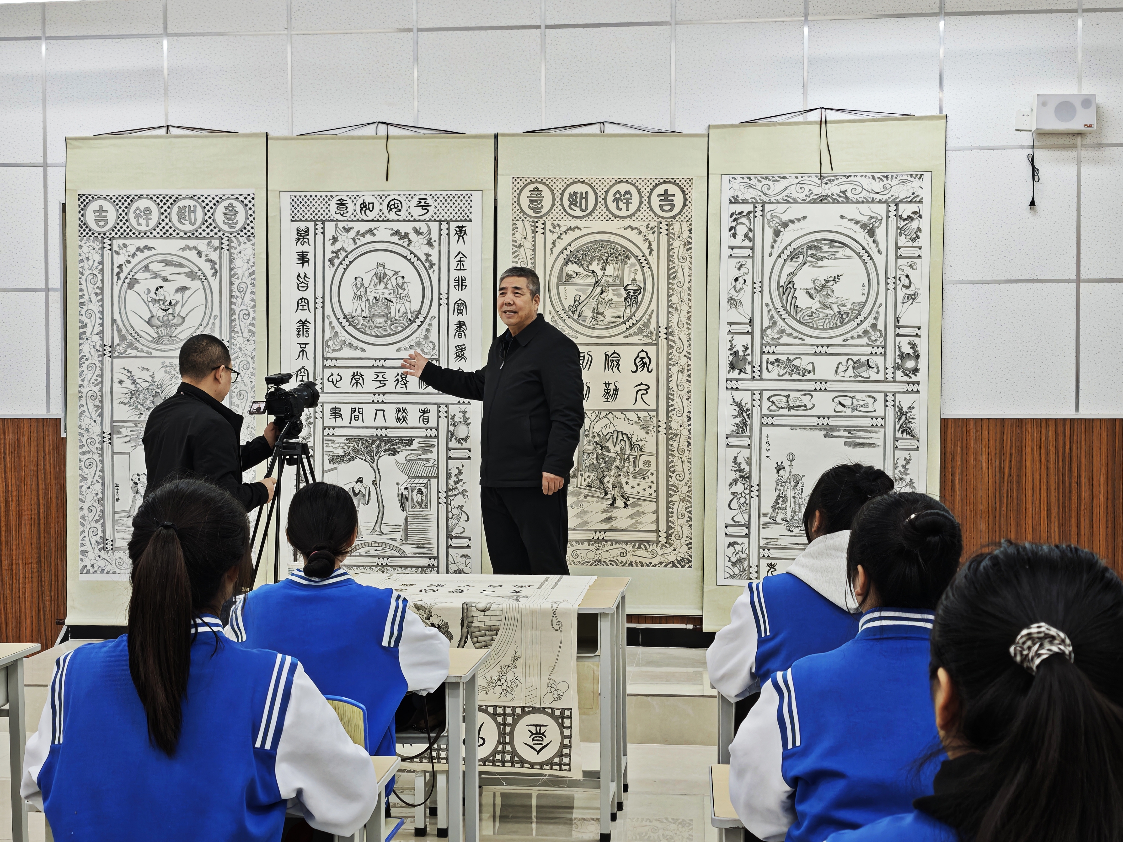 2024年12月3日,渭南广播电视台大型文化精品工程《百集非遗》栏目走进公司,由公司客座教授、渭南市皮影协会主席、省非物质文化遗产“澄城手绘门帘”传承人李天社为同学们讲授“澄城手绘门帘”的文化内涵与传承价值。活动由公司美育中心与渭南市民间文艺家协会共同承办。